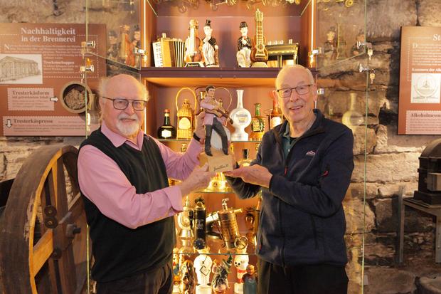 Das Schwäbische Schnapsmuseum hat von Manfred Thiel aus Mundelsheim seine einmalige Sammlung von 185 Spieluhren-Schnapsflaschen erhalten. Er hat diese Sammlung in 40 Jahren aufgebaut, die von der ganzen Welt stammen. Diese Sammlung ist ein Symbol für die Verbindung von Musik und Schnaps. Im Sockel der Flaschen sind Spieluhren eingebaut, welche mit der Musik beginnen, wenn die Flasche gehoben wird. Wir haben eine Vitrine herstellen lassen, in welcher nun im Keller unseres Museums die interessantesten Spieluhren-Schnapsflaschen präsentiert werden. Herr Thiel hat sich nun im Schnapsmuseum von der neuen Heimat seiner Sammlung überzeugt und war von der Präsentation begeistert.