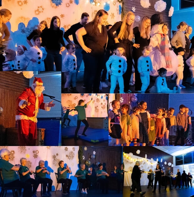 Das Bühnenprogramm begeisterte die vielen anwesenden Familien und Kinder: Das Eltern-Kind-Turnen mit Schneemann-Tanz, das Vorschulturnen mit „Pippi Langstrumpf“ und das Kinderturnen mit einer mitreißenden Turnvorführung sorgten für viel Freude. Die Frauengymnastik zeigte einen „Macarena“-Sitztanz, der auch Bewegungs- und Gedächtnistraining ist. Die Dienstagskursgruppen rundeten die Vorführungen mit ihrer stimmungsvollen Lichterstab-Gymnastik ab. Zwischendurch wurde zusammen gesungen. Unsere Junior-Assistenten im Kinderturnen, Anna und Elias, begleiteten dabei das Publikum auf dem Akkordeon.