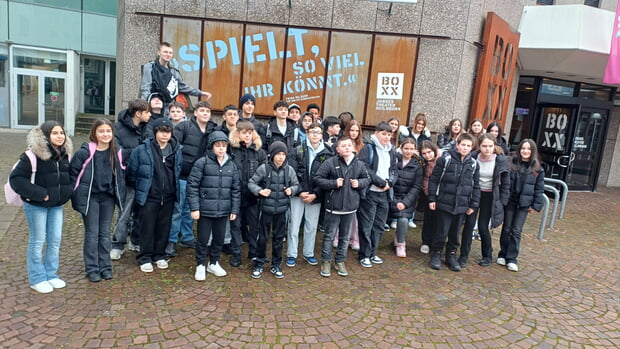 Die Klassen 7a und 7b unternahmen gemeinsam einen Theaterbesuch nach Heilbronn, um dort das Stück „35 Kilo Hoffnung“ zu sehen. Bereits im Vorfeld wurden die Schülerinnen und Schüler in einem begleitenden Workshop auf den Inhalt des Theaterstücks vorbereitet. Dabei setzten sie sich intensiv mit den zentralen Themen der Geschichte auseinander, was ihnen den Zugang zur Inszenierung deutlich erleichterte. Der Workshop wurde von allen Beteiligten als sehr gelungen empfunden.