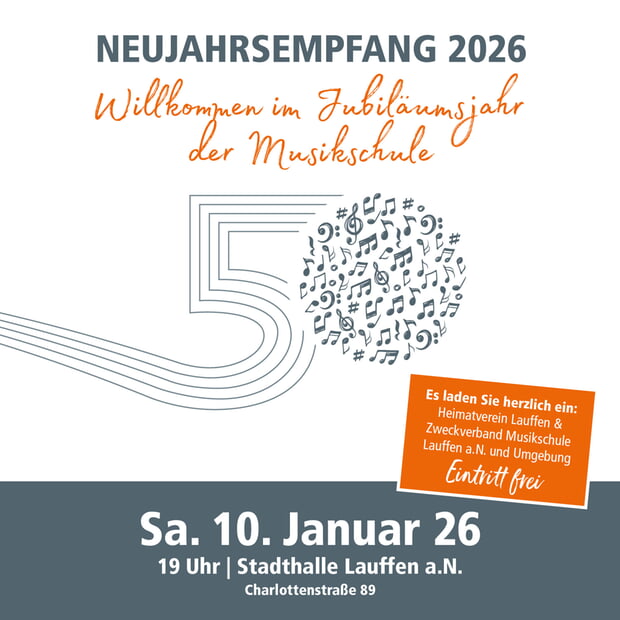 Gemeinsam mit dem Heimatverein Lauffen e. V. möchten wir Sie zum Start in unser Jubiläumsjahr am 10. Januar um 19.00 Uhr in die Stadthalle Lauffen einladen. Neben abwechslungsreichen musikalischen Darbietungen erwarten Sie unter anderem interessante Fakten zur Geschichte unseres Musikschulgebäudes, ein fotografischer Rückblick auf 50 Jahre Musikschule, kleine Überraschungen und selbstverständlich ein Getränk zum Anstoßen. Der Eintritt ist frei und wir freuen uns auf zahlreiche Gäste!