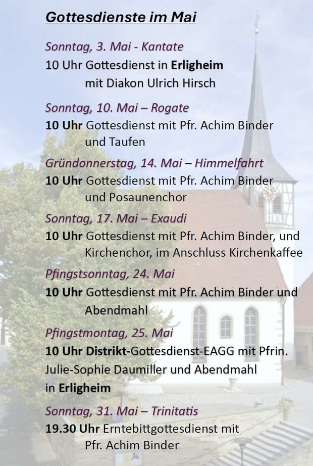 Bestimmt werden wir am Sonntag, 10. Mai ganz gespannt der Predigt von Pfr. Binder im Gottesdient um 10.00 Uhr in Kirchheim folgen.
