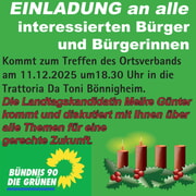 Der Ortsverband Neckar-Stromberg von Bündnis 90/Die Grünen lädt herzlich zu seinem nächsten Treffen am Donnerstag, 11. Dezember 2025 ein, bei dem die Landtagskandidatin von Bündnis 90/Die Grünen Meike Günter zu Gast sein wird und für Fragen und einen offenen Austausch zur Verfügung steht. Wir freuen uns auf Ihr Kommen.