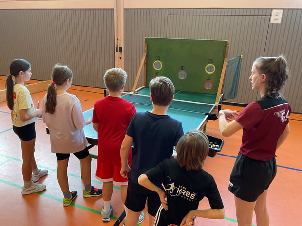 Unter der fachkundigen Anleitung von fünf Trainern des Vereins schnupperten die Kinder in den schnellsten Rückschlagsport der Welt hinein. An vielfältigen Stationen trainierten sie jene Fertigkeiten, die man für das Tischtennis braucht: Beim „Eierlauf“ mit dem Schläger war Balance gefragt, an der Ballmaschine ging es um die richtige Schlagtechnik und beim Zielschießen in Kastenteile bewiesen die Kinder enorme Treffsicherheit. Auch das Spiel über das Netz kam nicht zu kurz, wobei der Spaß sichtlich im Vordergrund stand. „Ich wusste gar nicht, dass man mit dem Ball so coole Tricks machen kann!“, staunte ein Drittklässler an der Koordinationsstation.