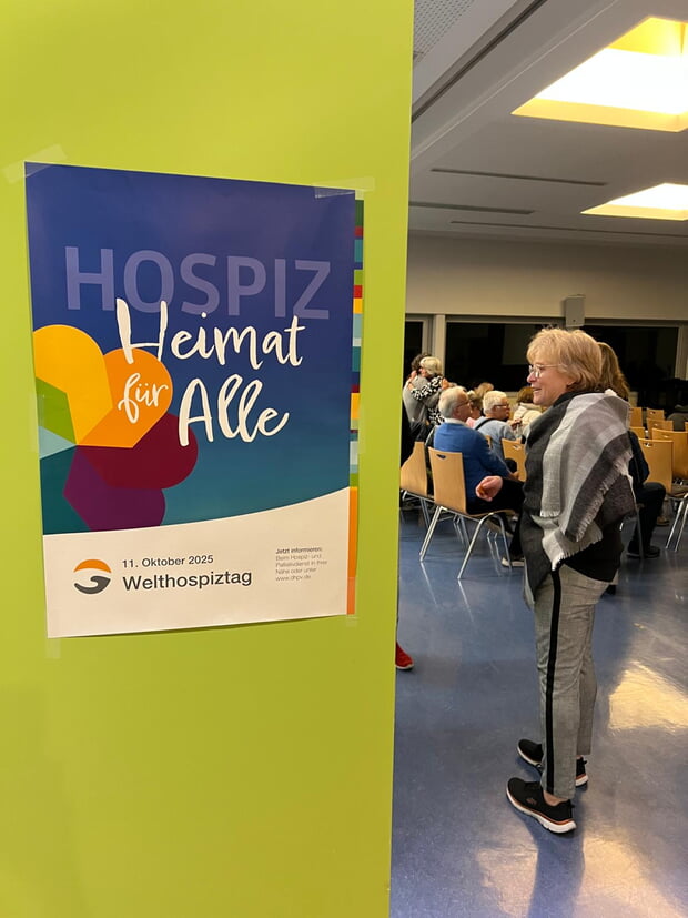 Bei Getränken und Snacks fanden bereits vor und nach dem Film angeregte Gespräche statt. Zwischen jungen und älteren Gästen sowie zwischen Menschen mit und ohne Erfahrung in der Hospizarbeit, dies war ein ermutigendes Zeichen, dass die Themen Leben, Sterben und Abschied alle Generationen berühren dürfen. Am Infostand konnten sich Interessierte über die vielfältige Arbeit des Dienstes informieren, etwa zum nächsten Qualifizierungskurs für Hospizbegleiterinnen und -begleiter, der im Sommer 2026 beginnen wird. Ein herzliches Dankeschön für die Räume geht an die Gastgeber, die Evangelische Kirchengemeinde Besigheim.