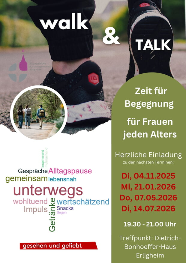 Herzliche Einladung zu Walk & Talk am 4. November 2025. Wir starten um 19.30 Uhr vor dem Dietrich-Bonhoeffer-Haus zu einem Spaziergang in und um Erligheim.