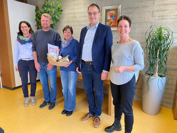 Der Bürgermeister überreichte die Dankesurkunde der Stadt Bönnigheim für 25 Jahre treu geleistete Arbeit im öffentlichen Dienst und einen Geschenkkorb. Auch die stellvertretende Fachbereichsleiterin Birgit Papendorf (re.), Carina Seber vom Bereich Personal (li.) und Personalratsvorsitzender Denis Doms (2.v.li.) wünschten der Jubilarin alles Gute, Gesundheit und weiterhin viel Freude bei ihrer Arbeit mit den Kindern.
