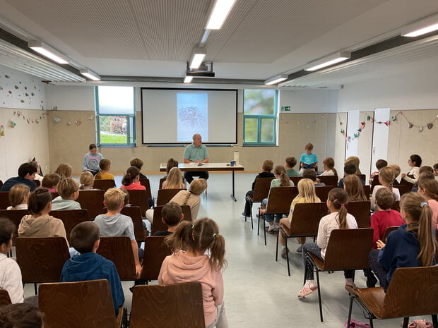 Abschließend hatten die Kinder zahlreiche Fragen, wie zum Beispiel: Wie sieht das Leben eines Autors aus? Oder: Wie ist es überhaupt möglich, sich solch fesselnde Geschichten auszudenken? Herr Theisen beantwortete alle Fragen geduldig und überließ uns Exemplare seines Buches. Wir freuen uns schon sehr darauf, zu erfahren, welche Abenteuer auf Fanni und ihren Vater in Monsterland warten. Vielen Dank, Herr Theisen, für diesen abwechslungsreichen und unvergesslichen Deutschunterricht.