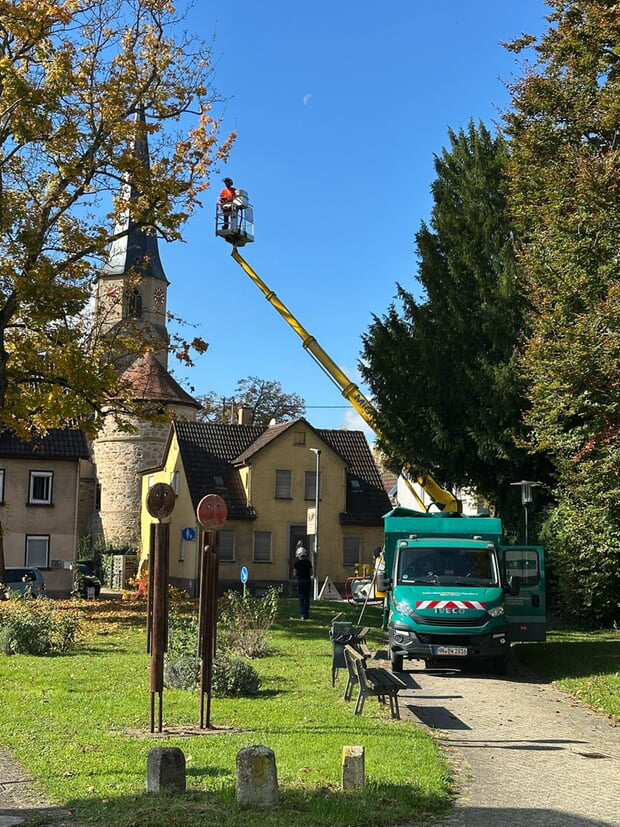 Seit 1. Oktober hat die Zeit der Rückschnitte und Pflege wieder begonnen. Im ganzen Stadtbereich werden nun wieder über die Winterzeit Bäume, Hecken und Sträucher zurecht geschnitten. Bei besonders hohen Bäumen kommt dabei wie auf dem Bild zu sehen auch mal eine Hebebühne zum Einsatz.