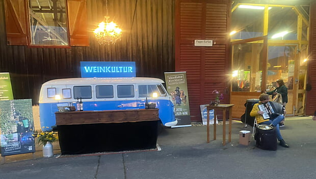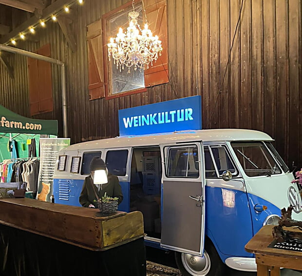 Vom 30.10. bis 2.11.2025 waren wir bei der Messe „Schön & gut“ im albgut in Münsingen. Wir durften uns mit unseren Markenzeichen präsentieren: dem blau-weißen Tour-Bully, dem Kronenleuchter, der auch alle anderen Events der WeinKultur sein Scheinen schenkt. Und natürlich: unseren Steillagenweinen, die beim Publikum genauso gut angekommen sind, wie wir das auch von zu Hause kennen.