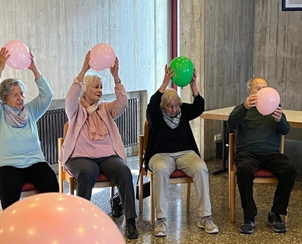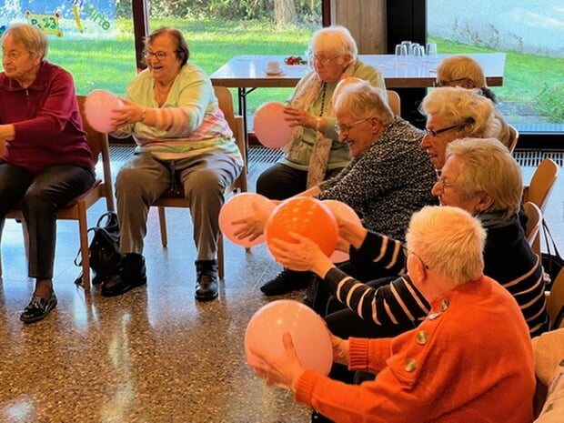 Im Anschluss ging es dann sportlich zu: Unter Anleitung wurden die Arme kräftig in Bewegung gesetzt, während bunt gemischte Luftballons von links nach rechts sowie von oben nach unten durch den Raum flogen. Die Bewegungsübungen aktivierten den ganzen Körper und förderten sowohl Flexibilität als auch Koordination. Die Teilnehmenden waren begeistert von der dynamischen Einlage, die Spaß und Gemeinschaftssinn vereinte.