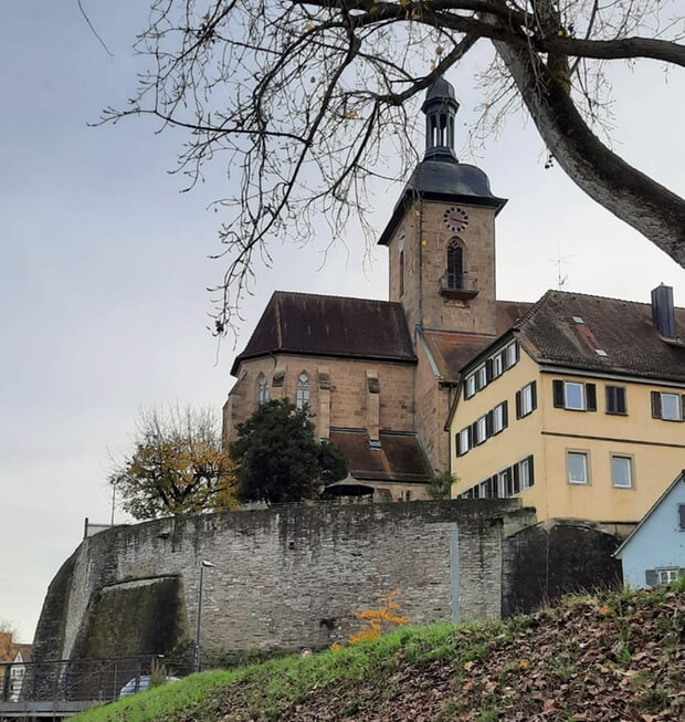 Vorbei an der alten Ölmühle ging es weiter über den „Kies“, entlang am Neckar bis zum Blick auf das Rathaus und der Vogelinsel, sowie auf die Regiswindiskirche. Nach einem steilen Aufstieg war die Regiswindiskirche erreicht. Die erste Kirche wird schon ums Jahr 700 erwähnt. Der Name „Regiswindis“ ist auf die Enkelin von Kaiser Ludwig, die von ihrer Amme getötet wurde, zurückzuführen. 1564 wurden große Teile der Kirche durch einen Blitzschlag zerstört, danach erfolgte der Umbau zur Hallenkirche.