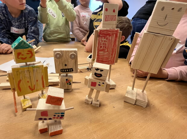 Erstaunlich, was da nach einer kurzen Einführung in die Werkzeugkunde so alles entstand: Helikopter, Flugzeuge, Roboter, Holzherzen, Fahrzeuge, ein Kätzchen und sogar eine Libelle. Alles selbst geplant, gesägt, gebohrt und geschmirgelt … Gar nicht so einfach, da für viele Kinder der Gebrauch einiger Werkzeuge noch fremd war. Großes Lob gab es am Ende von der Kursleiterin. Zu Recht!