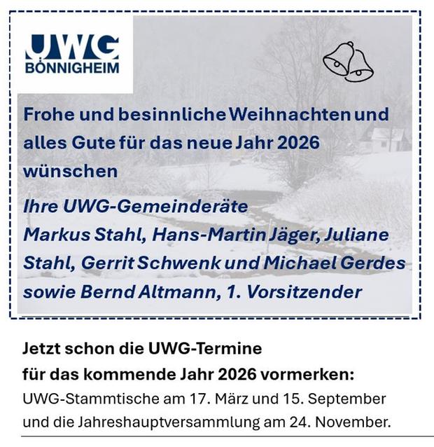 Rubrikenübersicht > Stadt Bönnigheim > Parteien, Wählervereinigungen (Bönnigheim) > UWG > UWG Termine 2026