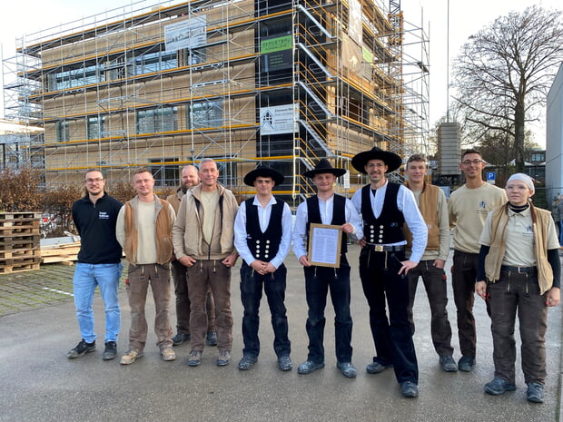 Die Handwerker stiegen aufs Dach des nun dreigeschossigen Gebäudes, um den Richtspruch zu halten. Der Zimmermann in echte Kluft verkündete: „… Fortan diene dieser Ort dem guten Rat, dem edlen Wort. Und uns’re hoffnungsvolle Jugend lerne Ehrbarkeit und Tugend. Nicht nur Wissen, Geistesgaben, auch Charakter muss man haben. …“ Weiter wünschte er, dass der schulische Erfolg erblühe, ein guter Geist einziehe und die Schulgemeinschaft gedeihen möge. Der Redner warf sein Trinkglas hinunter auf den Grund, wo es zersplitterte und weihte so das Haus den guten Wünschen. Anschließend luden Bauleiterin und Architekten zur Besichtigung des nachhaltigen Bauwerks ein. Um Material und Kosten einzusparen und ökologisch sinnvoll zu handeln, so erläuterten sie, habe das Planungsteam konsequent auf Wiederverwendung und Ressourcenschonung gesetzt. Alles, was baulich weiter nutzbar war, sei integriert worden. So wurde der Rohbau des Bestandsgebäudes, also Bodenplatte, Stützen und Geschossdecken, erhalten und für die Aufstockung ertüchtigt. Fürs Tragwerk der Erweiterung habe man eine leichte Holzkonstruktion eingebaut. Die Außenwände seien nur aus nachhaltigen Materialien wie heimischem Holz gebaut. Auf der Nordseite bestehe die Fassade teilweise aus 30 Zentimetern ungedämmtem Stahlbeton. Dieser werde mit Dämmplatten und einer vorgehängten Holzschalung versehen, um sie ans neue Fassadenbild anzupassen. Die Außenwände auf der Südseite des ersten Obergeschosses blieben erhalten. Zudem werden die Betonfertigteile der Bestandsfassaden soweit möglich in die neue Fassade integriert. Auch die bestehenden Fenster aus dem Jahr 2009 wurden wiederverwendet. Das Flachdach wird eine extensive Dachbegrünung und eine aufgeständerte PV-Anlage erhalten.