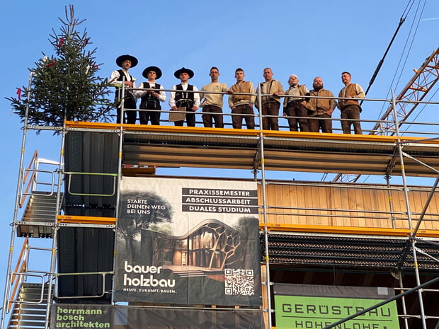 Mit einem traditionellen Richtfest feierte die Stadt vergangene Woche den nächsten Meilenstein „ihres größten Investitionsprojekts, das die Stadt mit einer Bausumme von fast 18 Millionen Euro – mit Interimsgebäude - jemals getätigt hat“, sagte Bürgermeister Albrecht Dautel in seiner Ansprache vor der fast fertiggestellten Gebäudehülle. Damit sind die Rohbau- und Holzbauarbeiten der baulichen Erweiterung von Bau II im Schulzentrum nahezu abgeschlossen und das Gebäude regendicht. Der Verwaltungschef begrüßte die anwesenden Gemeinderäte, zahlreiche städtische Mitarbeiter, die mit dem Bau beruflich befasst sind, Vertreter der Schulen, die Architekten Prof. Gerhard Bosch und Irene Bidlingmaier des Büros Herrmann + Bosch Architekten Stuttgart sowie deren Bauleiterin Katja Detering. Ebenso die beteiligten Handwerker der Firma Amos, die die Rohbauarbeiten mit Rückbau und Aufbau ausgeführt haben und der Firma Bauer Holzbau, die die vorgefertigten Module passgenau einbauten.