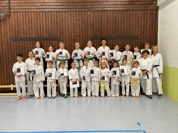 Am 10. Dezember fand in der Karateabteilung des TSV Bönnigheim eine Kinderprüfung statt. Dabei zeigten die jungen Karatekas ihr Können in verschiedenen Prüfungsbereichen wie Kihon, Kata, Bunkai und Selbstbehauptung, die für die nächste Graduierung erforderlich waren. Prüferin Manuela Gottlöber (4. Dan, zweite von rechts in der ersten Reihe) zeigte sich mit den gezeigten Leistungen äußerst zufrieden.