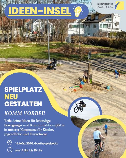 Kommt am Samstag, 14.3.2026 zwischen 14.00 und 16.00 Uhr zum Goethespielplatz. Dort erwarten euch Mitglieder des Arbeitskreises Bewegungsflächen, die sich über Ideen und Anregungen freuen, wie der Platz gestaltet werden kann. Wie groß soll die Sandfläche sein? Welche Geräte für Kinder und Jugendliche sollen aufgebaut werden? Welche Möglichkeiten gibt es, um die Aufenthaltsqualität zu erhöhen? Was habe ich woanders gesehen und könnte es mir gut in Kirchheim vorstellen? Diese und andere Fragestellungen gibt es und wir freuen uns über eure Impulse.