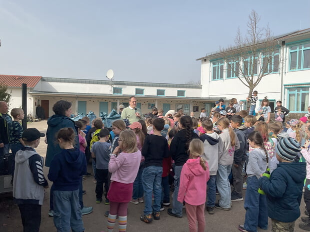 Herr Bürgermeister Dautel nahm als Vertretung für Bürgermeister Schäuffele an der Aktion teil und ließ es sich nicht nehmen, einige Zeit mit den Schülerinnen und Schülern auf dem Pausenhof zu verbringen. Er bedankte sich persönlich bei den Kindern für ihr Engagement und lobte ihren wichtigen Beitrag für eine saubere Umwelt.
