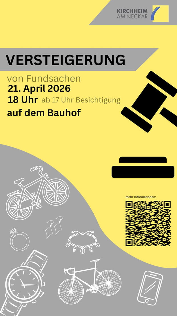 am 21. April 2026 um 18.00 Uhr findet die Versteigerung der Fundsachen der Gemeinde Kirchheim am Neckar statt. Hierzu laden wir Sie herzlich ein.