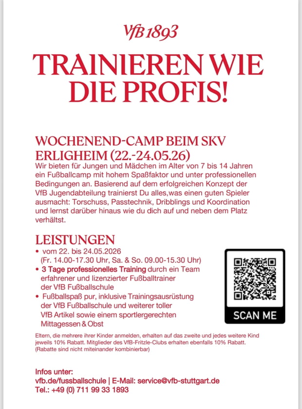 Fast schon zur Tradition geworden ist die Austragung der VfB-Fußballschule in Erligheim. Auch dieses Jahr bieten ausgebildete Trainer des VfB Stuttgart ein 3-tägiges professionelles Fußballtraining auf unserem Sportgelände an. Meldet euch jetzt an.