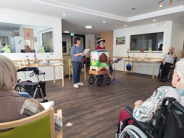 Am Mittwochnachmittag, 8.4.2026, kamen Frau Noller (Angehörige) und Frau Weiß mit ihrer Drehorgel ins Kleeblattheim. Nach der Begrüßung durch Frau Fili (Betreuungskraft) begann das „Drehorgelkonzert“. Es wurden Frühlingslieder und bekannte Volkslieder gespielt. Die Liederbücher waren schon im Voraus ausgeteilt worden, damit die Senioren auch textsicher mitsingen konnten. Mit Rätseln um Frühlingsblumen und verschiedenen Bauernregeln wurde das Liedgut zwischendurch aufgelockert. Mit einem herzlichen Applaus wurden Frau Noller und Frau Weiß verabschiedet. Man durfte auch das Innenleben der besonderen Orgel bestaunen.
