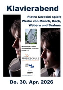 Am Donnerstag, 30. April um 19.30 Uhr tritt der aus Parma stammende Pianist Pietro Ceresini, der an den Musikhochschulen Freiburg und Innsbruck lehrt, auf dem Steinway-Flügel in der Südstraße auf. Es erklingen Werke von Johann Sebastian Bach, Anton Webern, Johannes Brahms und Martin Münch.
